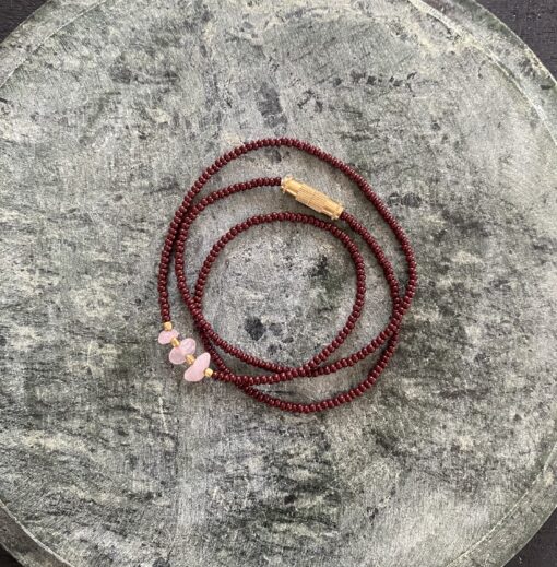 NURI-halskæden fra Annavii er et elegant og tidløst smykke, der kombinerer dybrøde/brune glasperler med en smukke Rose Quartz sten som midtpunkt. Halskæden er afsluttet med messing, der gør den nem at tage af og på, samtidig med at den tilføjer et eksklusivt præg. Perfekt til både hverdag og festlige lejligheder.