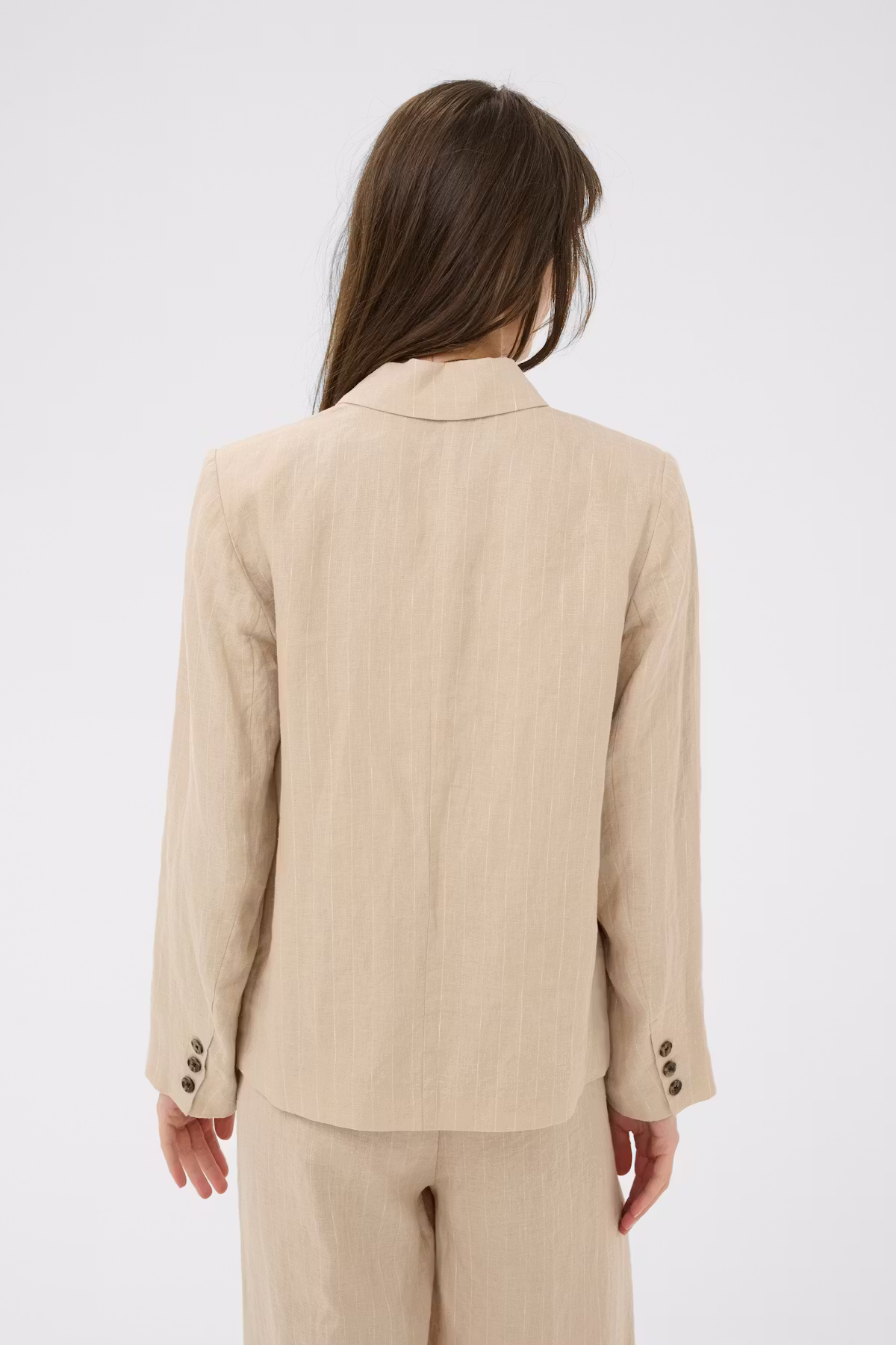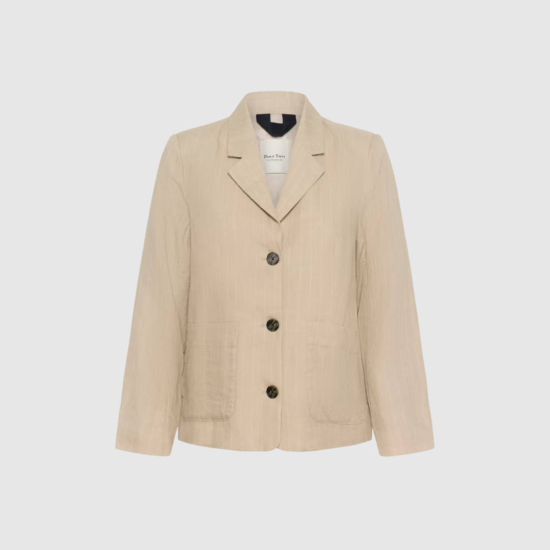 Den neutrale farve med fine lodrette striber gør blazeren let at kombinere sæson efter sæson og sikrer, at den hurtigt bliver en fast favorit i garderoben.