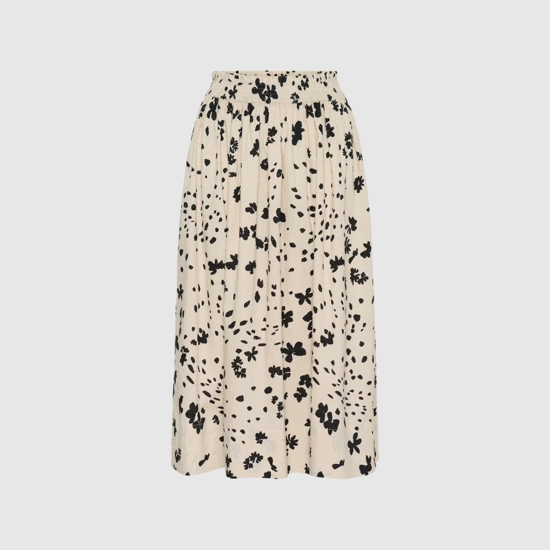 Det smukke all-over blomsterprint tilfører et friskt og moderne touch, mens stoffets let teksturerede overflade giver et mere eksklusivt og levende look. Den rynkede, elastiske linning gør nederdelen utrolig behagelig at have på, og sørger for en fleksibel pasform, der sidder flatterende på forskellige kropstyper. Tilmed er den udstyret med praktiske sidelommer, som giver et afslappet og funktionelt præg uden at kompromittere stilen.