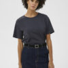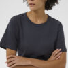 T‑shirten har korte ærmer og rund hals, hvilket understreger det rene og minimalistiske design. Den mørkeblå nuance gør den let at kombinere med både lyse og mørke farver og gør den oplagt som base i lag‑på‑lag styling under strik, jakker eller skjorter.