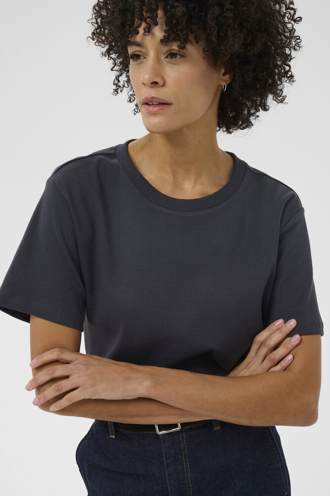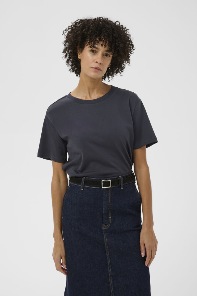 T‑shirten har korte ærmer og rund hals, hvilket understreger det rene og minimalistiske design. Den mørkeblå nuance gør den let at kombinere med både lyse og mørke farver og gør den oplagt som base i lag‑på‑lag styling under strik, jakker eller skjorter.