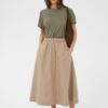 Det fulde skørt er let rynket, hvilket giver ekstra bevægelse og volumen uden at virke tung. Den elastiske linning sikrer en god og fleksibel pasform, der sidder komfortabelt hele dagen. Den glatte overflade og det enkle udtryk gør nederdelen alsidig og nem at style – både med strik, T-shirts, skjorter og lette toppe. Et design der emmer af nordisk enkelhed og tidløshed.