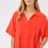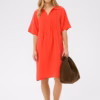 Designet er enkelt og stilrent med korte ærmer og en flatterende V‑hals, som tilfører et moderne og feminint touch. Foran finder du fine læg, der giver stoffet et smukt fald og skaber ekstra bevægelse, når du går. Den afslappede pasform gør kjolen let, luftig og utrolig behagelig – et oplagt valg til både hverdage, ferier, strandture og afslappede arrangementer.