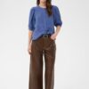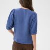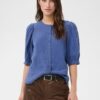 Designet er enkelt og tidløst med en rund halsudskæring og en klassisk knaplukning foran. Skjorten har korte ærmer med let volumen, hvilket skaber et blødt og feminint udtryk uden at virke overdressed. Den lette, afslappede pasform falder naturligt og giver et ubesværet, velklædt look.