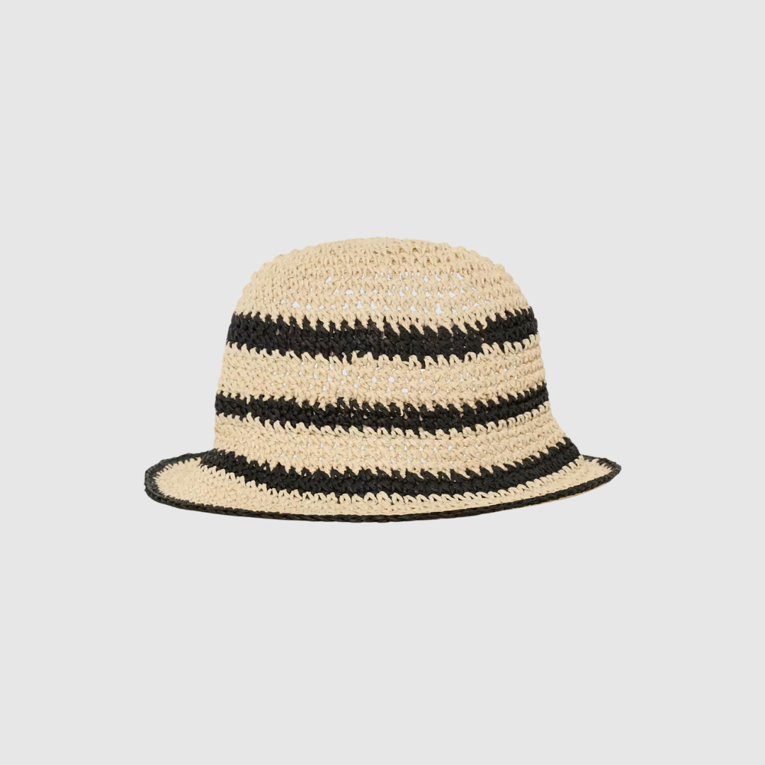 Det vævede og strukturerede materiale tilfører hatten et håndlavet præg, der passer perfekt til sommerens outfits. Det stribede udtryk i black stripe giver et grafisk og tidløst look, som er nemt at kombinere med både kjoler, skjorter og mere casual sommerstyles. BeintaPW Hat er et alsidigt accessory, der fuldender looket med et naturligt og afslappet touch.