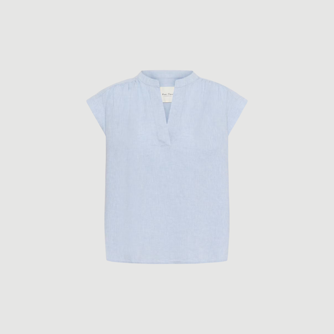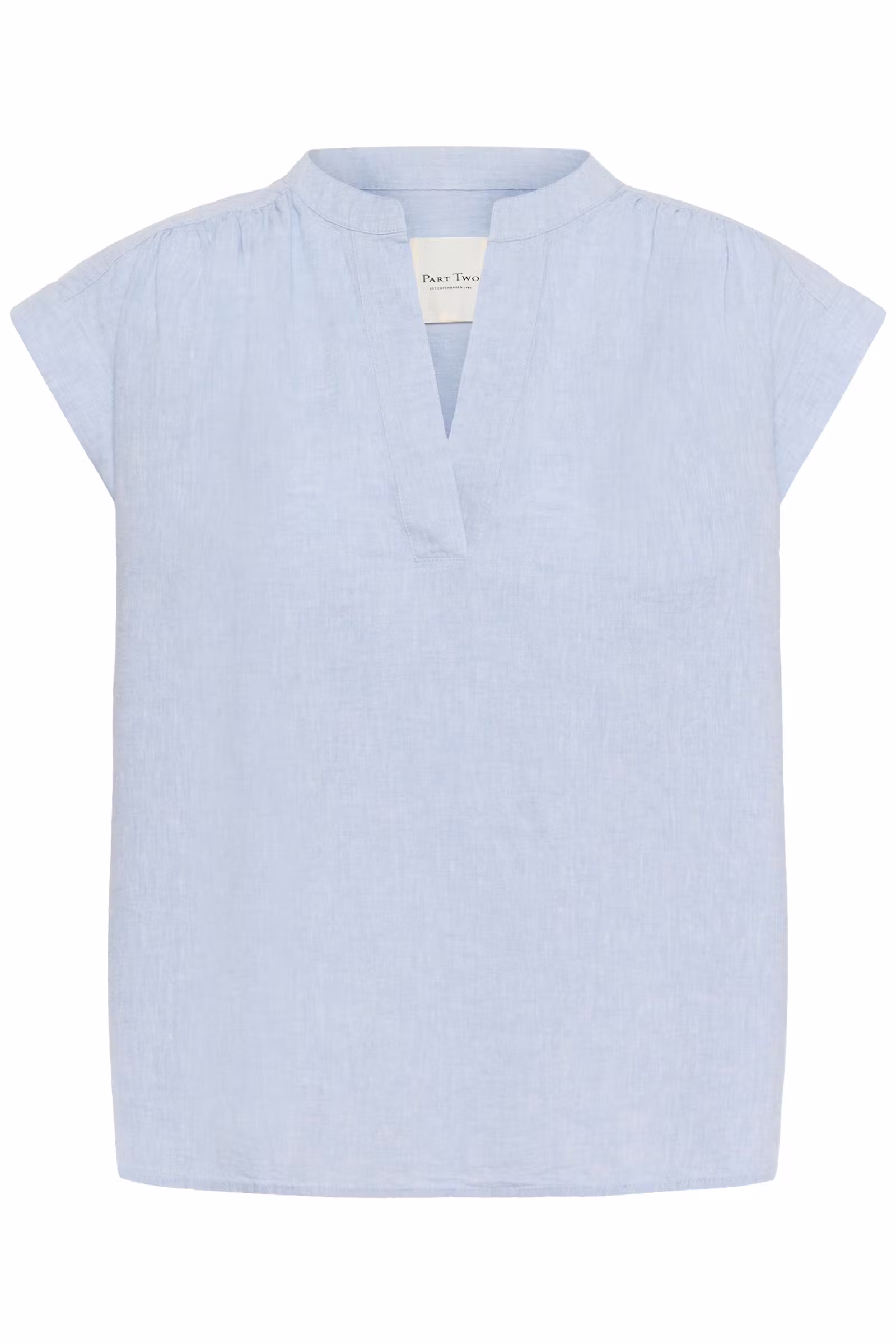BettinaPW Bluse fra Part Two er en let og elegant bluse med et afslappet, tidløst udtryk. Den lyseblå chambray‑farve giver et friskt og sommerligt look, mens det enkle design gør blusen nem at style til både hverdag og mere pæne anledninger. Blusen har en lige, løs pasform og korte, brede ærmer, som skaber et luftigt og behageligt udtryk. Den delte V‑udskæring giver et feminint touch, og de diskrete rynkedetaljer ved skuldrene tilfører struktur og let bevægelse i stoffet.