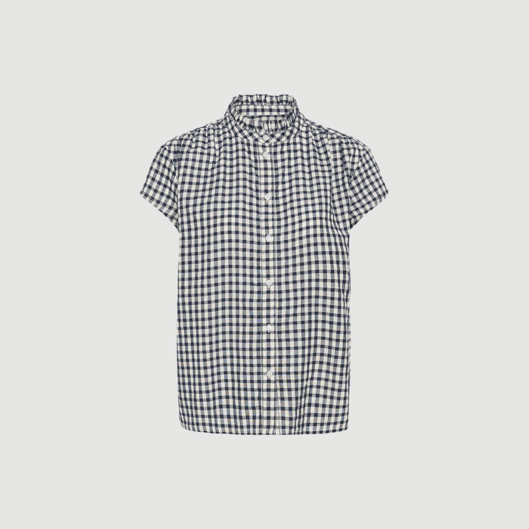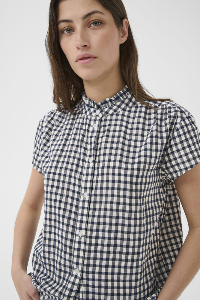 Designet er detaljeret med korte ærmer, knaplukning foran og en let rynket standkrave, som tilfører blusen et feminint og velafbalanceret look. Den sprøde og let strukturerede kvalitet gør blusen både elegant og casual på samme tid.