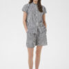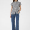 Designet er detaljeret med korte ærmer, knaplukning foran og en let rynket standkrave, som tilfører blusen et feminint og velafbalanceret look. Den sprøde og let strukturerede kvalitet gør blusen både elegant og casual på samme tid.