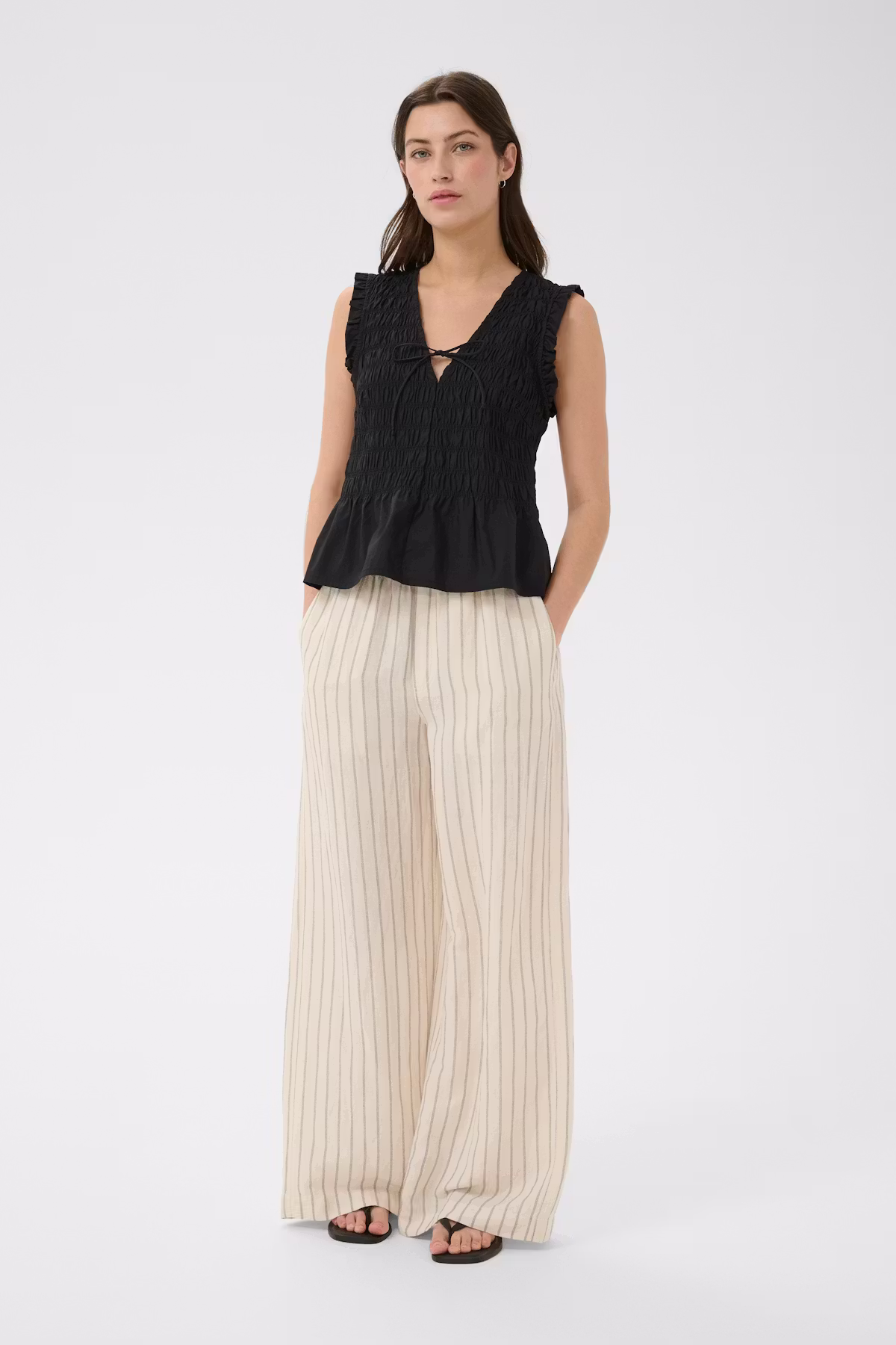 Toppen er ærmeløs og afsluttes med fine flæsekanter ved skuldrene, som giver et blødt og romantisk præg. Den let udstillede kant forneden skaber en flot silhuet og tilfører bevægelse til designet. BorgnyPW Top er fremstillet i 100 % økologisk bomuld, hvilket gør den let, åndbar og ideel til varme dage.