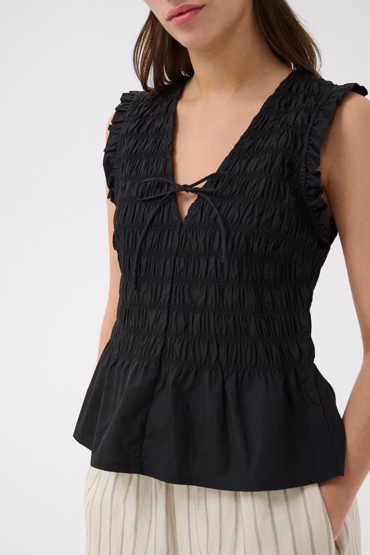 - Ærmeløs med flæsekanter ved skuldrene