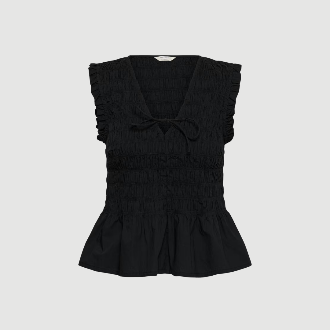 BorgnyPW Top fra Part Two er en elegant og feminin top, der kombinerer komfort med fine detaljer. Den smockede overdel giver toppen en figursyet pasform, som smukt følger kroppen og samtidig føles behagelig at have på. Den dybe V-udskæring med dekorativ snøredetalje fremhæver et feminint udtryk og tilfører et let, sommerligt look.
