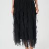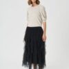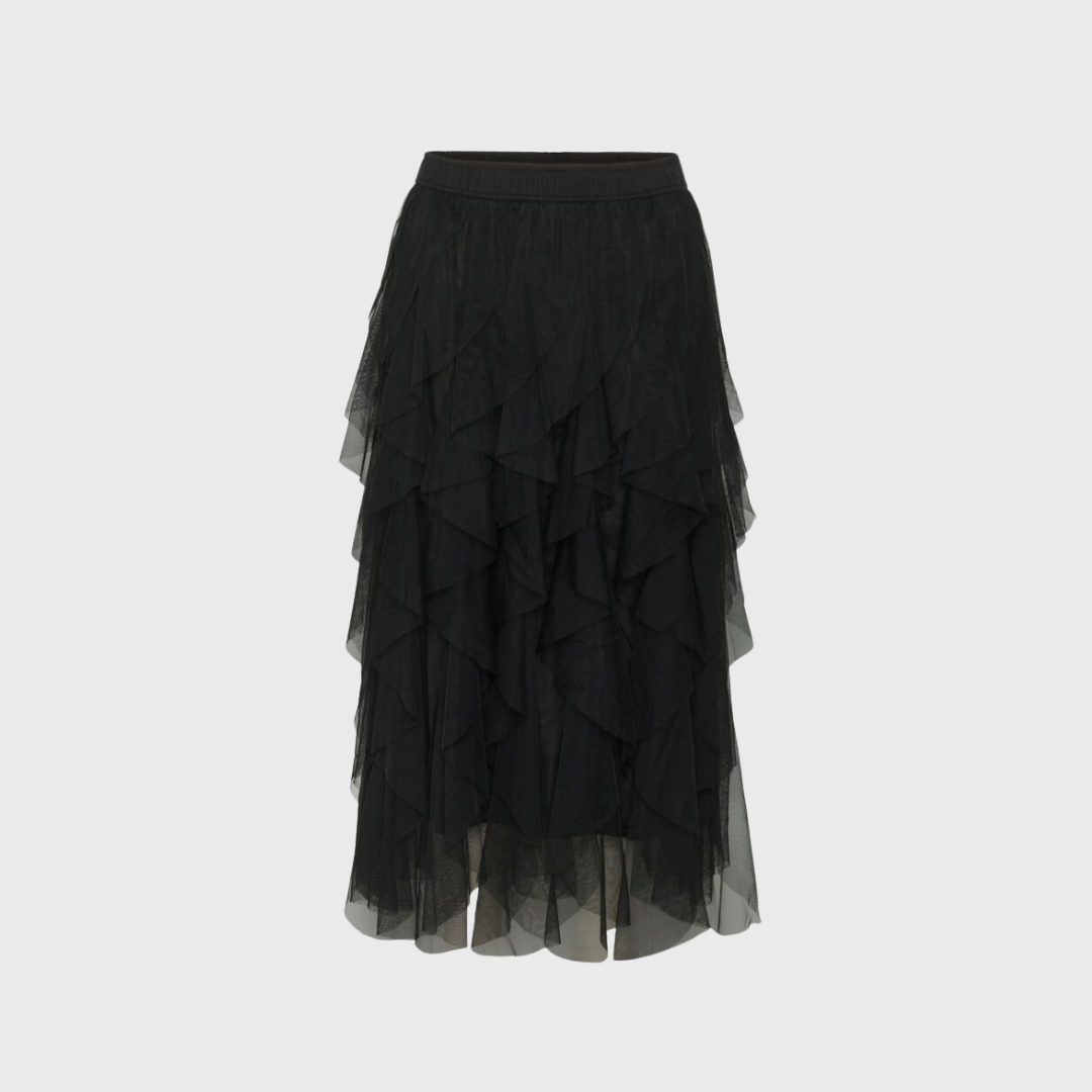 SvanhildPW SK er en elegant sort nederdel med feminine flæsedetaljer og en behagelig elastisk talje. Den vævede kvalitet og lette struktur giver et flot fald, mens længden lige over anklerne gør den ideel til både hverdag og fest. Et alsidigt design, der kan styles med alt fra strik til skjorter.