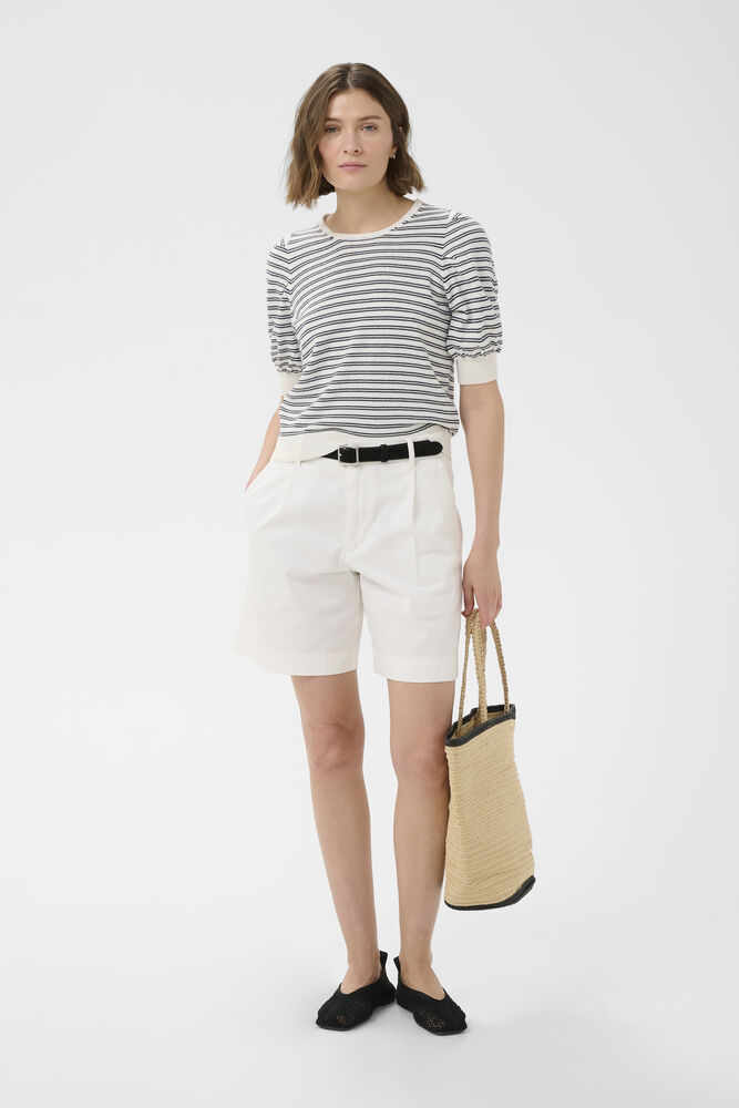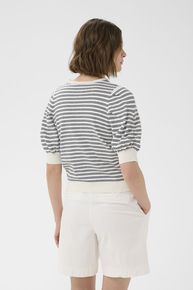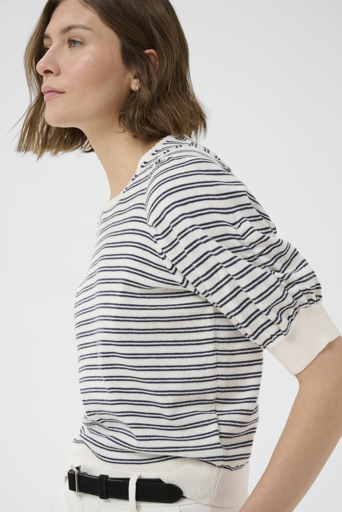 De korte ærmer giver pulloveren et let og moderne udtryk, der gør den ideel til forårs‑ og sommergarderoben. Samtidig gør det enkle design den oplagt til lag‑på‑lag styling – brug den alene med bukser, jeans eller nederdel, eller kombiner den med en let skjorte under for et mere gennemført look.