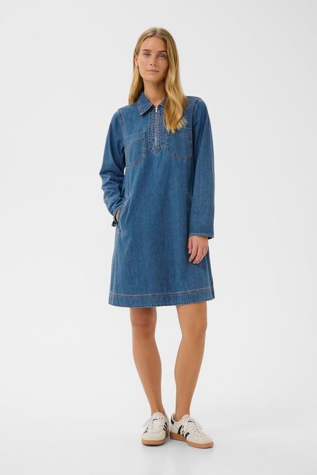 YaliaPW DR fra Part Two er en elegant denimkjole med et tidløst design og en normal pasform, der giver et afslappet og stilfuldt look. Kjolen har lange ærmer og en længde under knæet, hvilket gør den perfekt til både hverdagsbrug og mere casual anledninger. Fremstillet i en blød blanding af bomuld og TENCEL™ lyocell for høj komfort og holdbarhed.