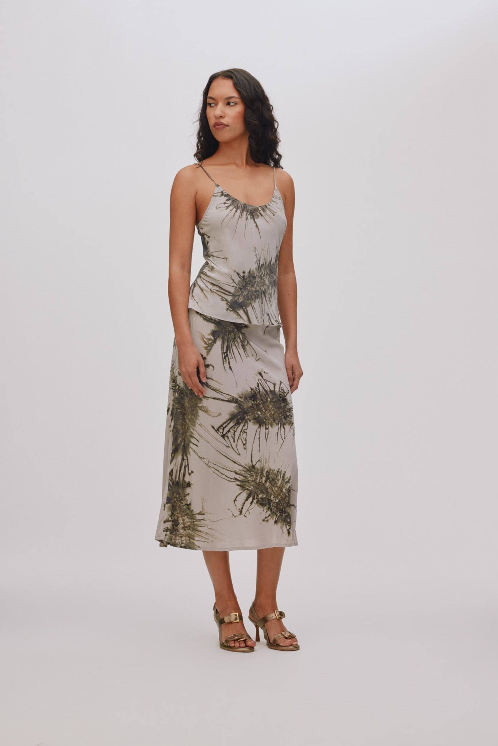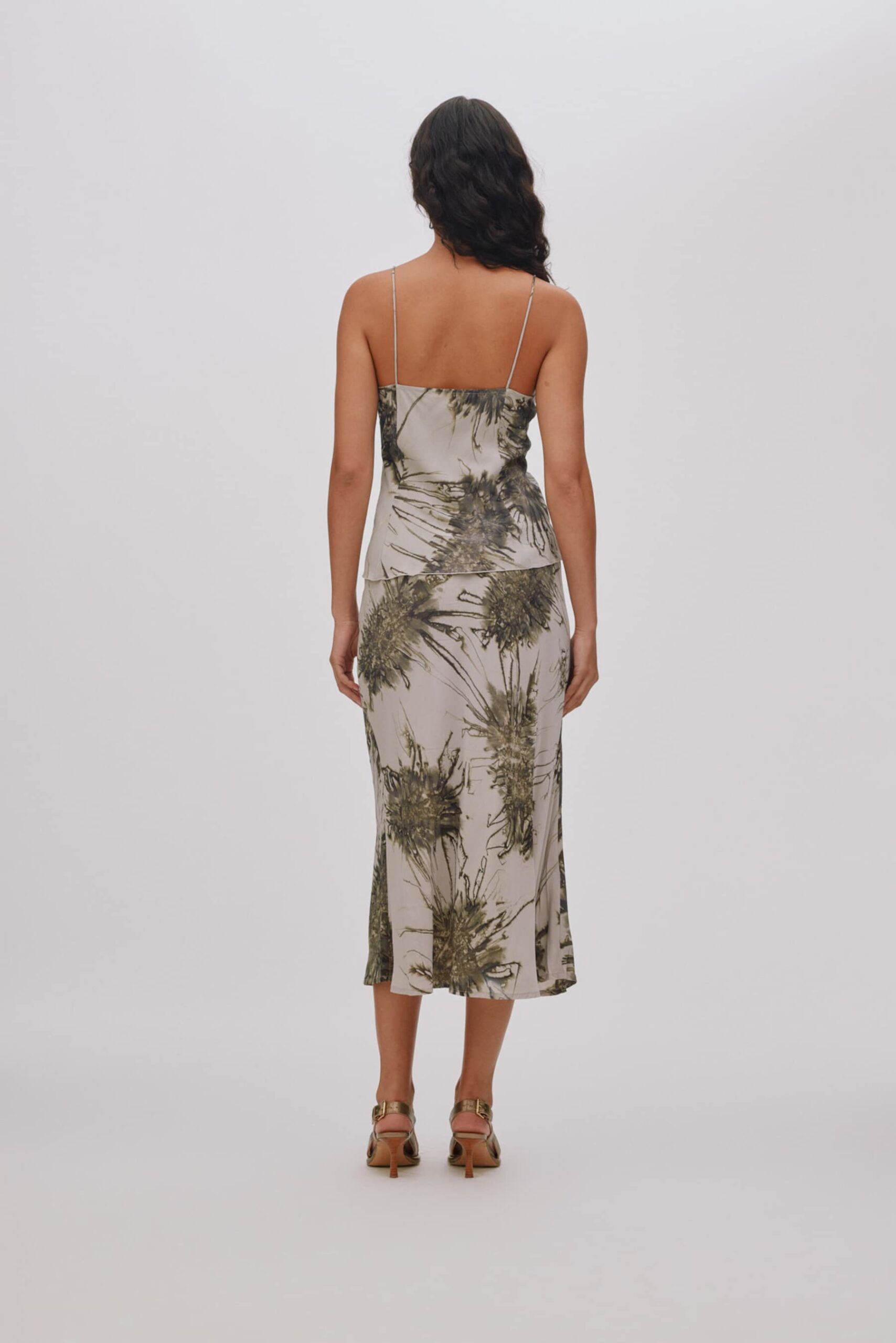 Silhuetten formes af det flatterende bias‑cut, der elegant omfavner kroppens former, mens den elastiske talje sikrer en komfortabel og fleksibel pasform.