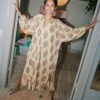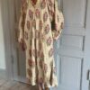 Da printet er håndlavet med block print‑teknik af dygtige artisans, vil der forekomme naturlige variationer, små ujævnheder og fine detaljer, som er en del af kjolens charme og autenticitet.