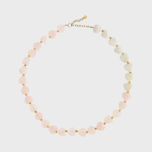 Bring et friskt pust og et strejf af ro ind i dit look med Stine A – Mon Amour Halskæde, romantisk halskæde bestående af 22 hjerter af rosakvarts og 8 hjerter af rainbow moonstone..